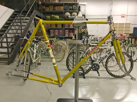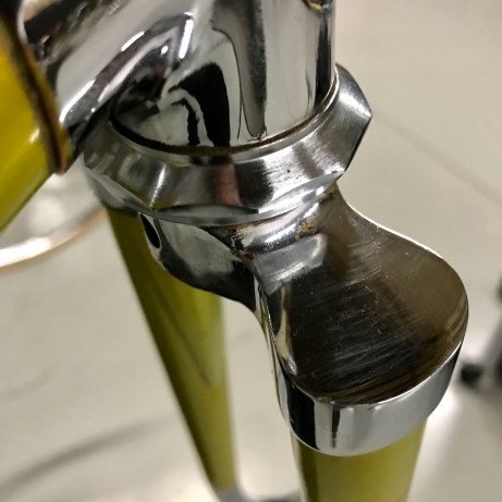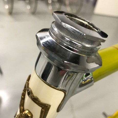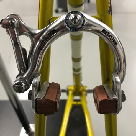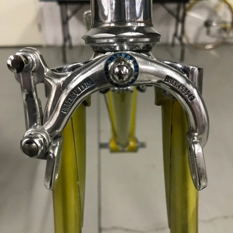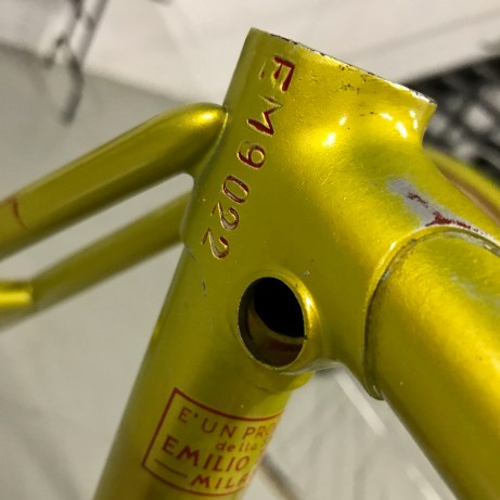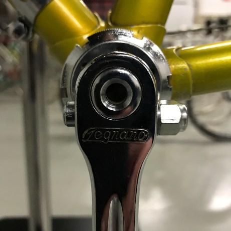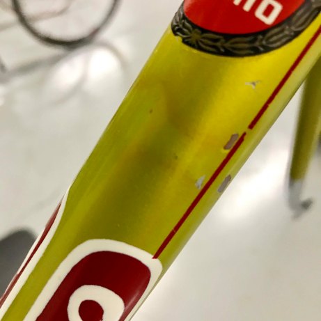The factory Legnano ‘lizard yellow’ lacquer is very fragile (as is the white banding on the head tube and seat tube), so you don’t want to go near it with anything that is abrasive or may contain solvent. On the more stubborn areas I sometimes use a bit of Windex but even here the ammonia can begin to remove the paint, so work very carefully with a soft white cloth to monitor things. The waterslide decals can also be very fragile as they dry out over the years.