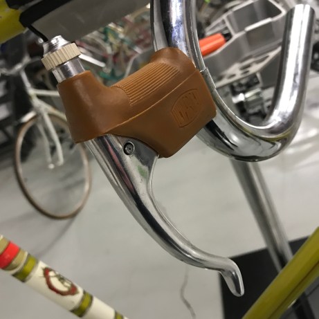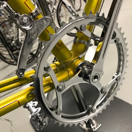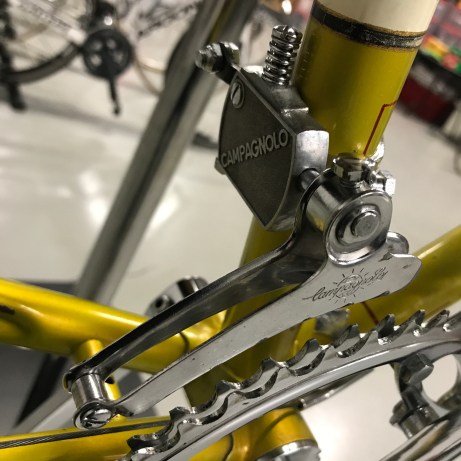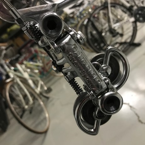 The Campagnolo Gran Sport ‘plunger-style’ front derailleur. A bit of a ‘kitschy’ part in my opinion but it worked ok on a short jump (in this case 47/50T) and it was in production for about 20 years, finishing its days as part of the Valentino group.