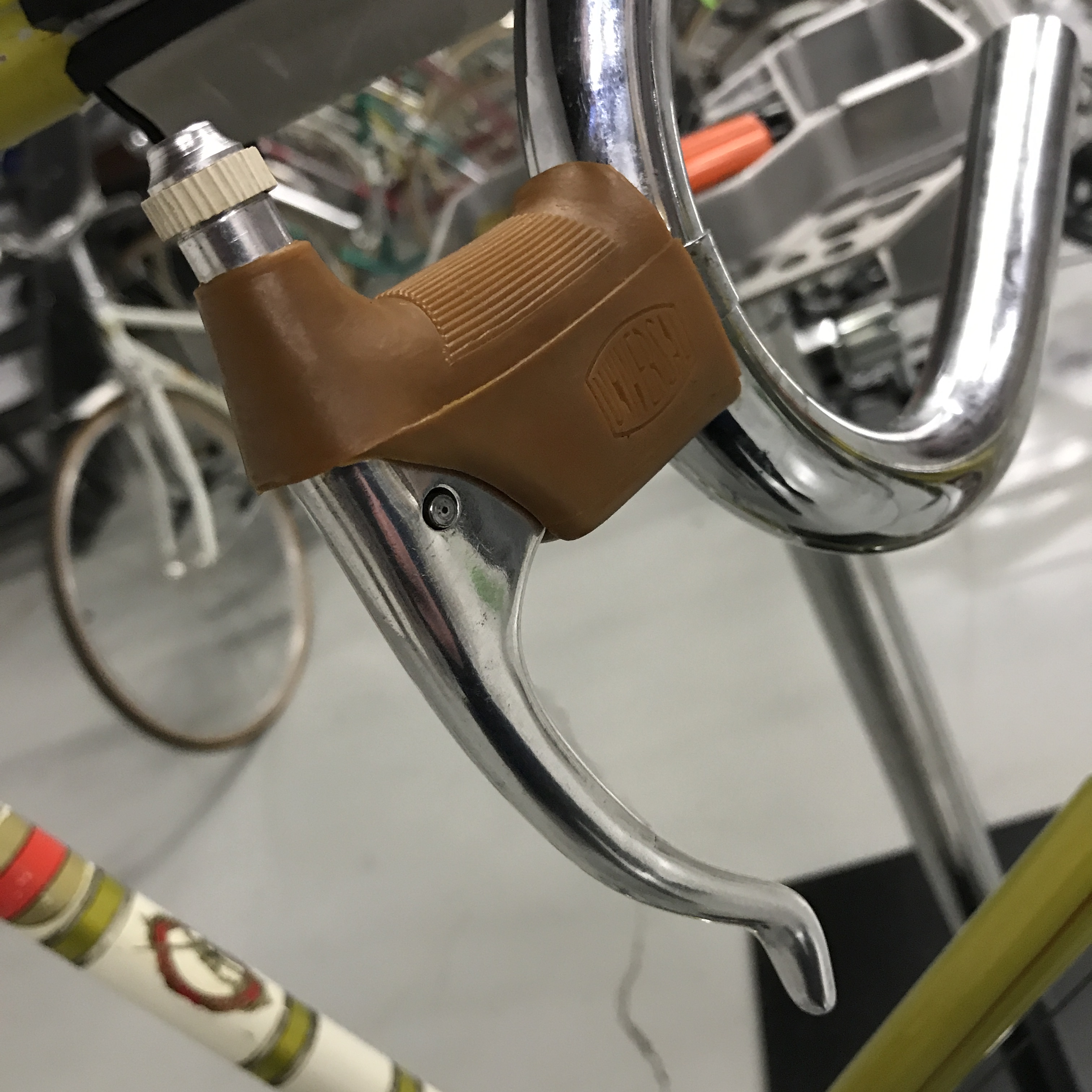 Universal Mod.51 brake levers with pointy ends and the serrated rubber adjustment ring. The rubber adjustment ring was not very durable and it was replaced with a black, dome-shaped rubber cover when Universal introduced the Mod.61 centerpull brakes in 1961. The pointy ends on the brake levers were also rounded off with the Mod.61 introduction.