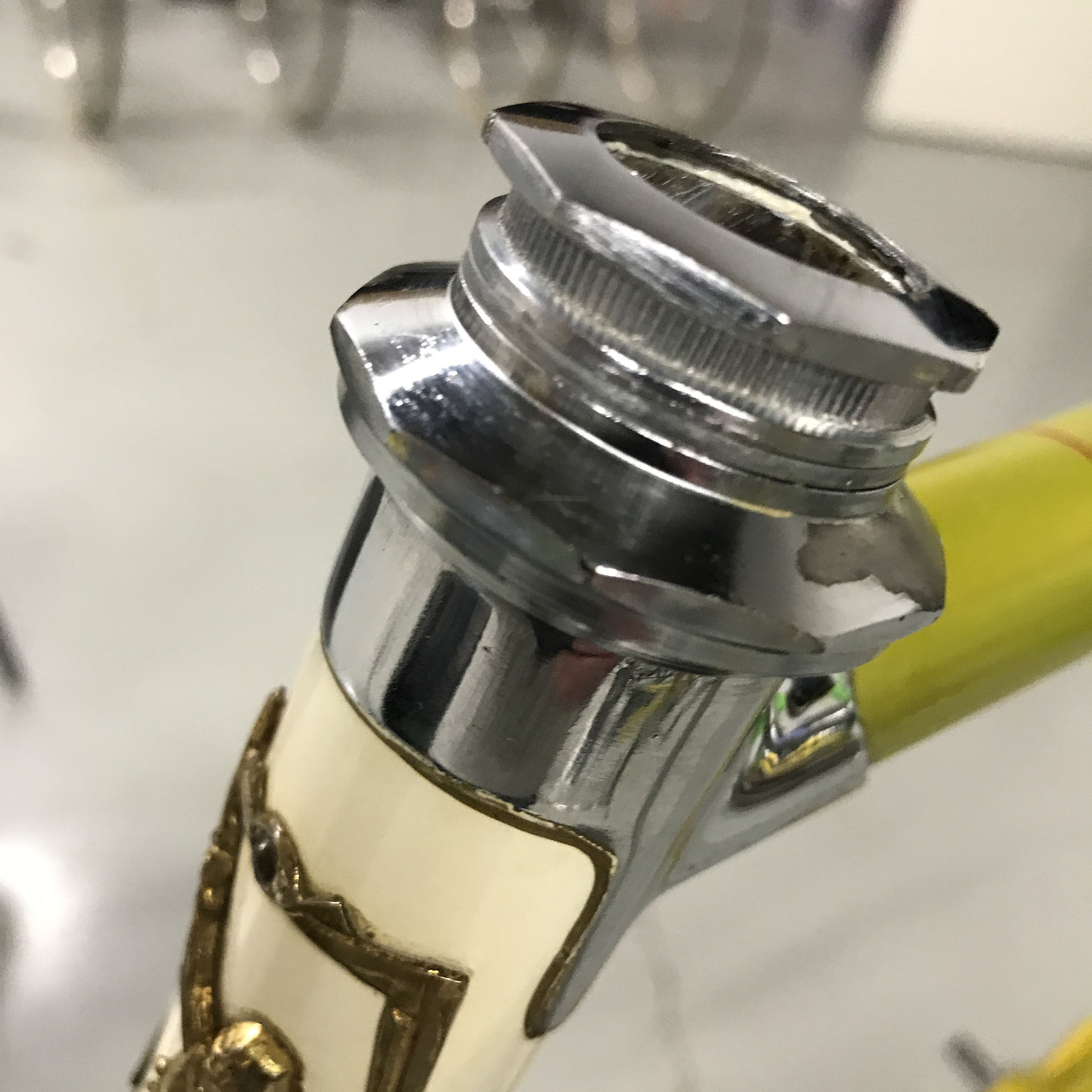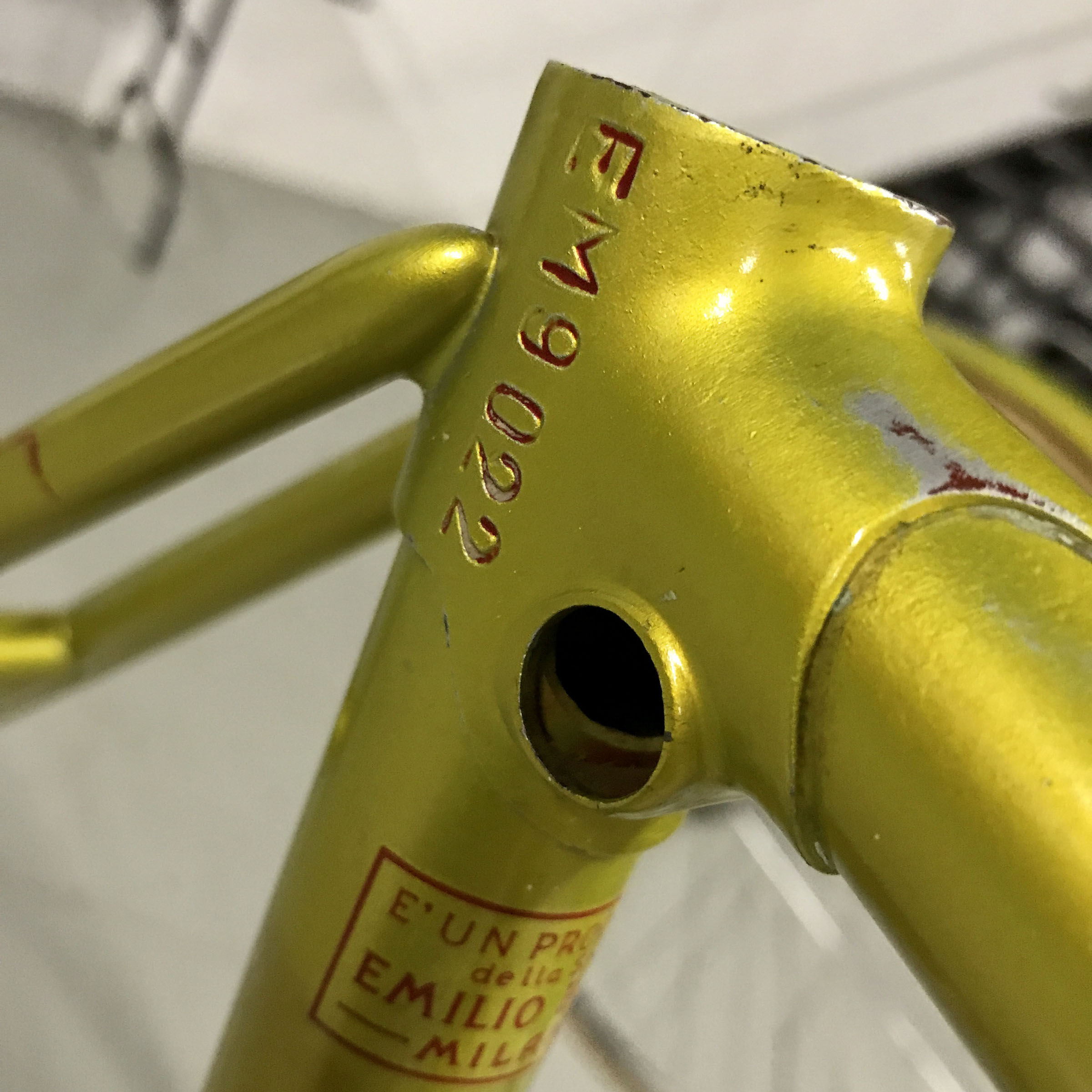 The factory Legnano ‘lizard yellow’ lacquer is very fragile (as is the white banding on the head tube and seat tube), so you don’t want to go near it with anything that is abrasive or may contain solvent. On the more stubborn areas I sometimes use a bit of Windex but even here the ammonia can begin to remove the paint, so work very carefully with a soft white cloth to monitor things. The waterslide decals can also be very fragile as they dry out over the years.