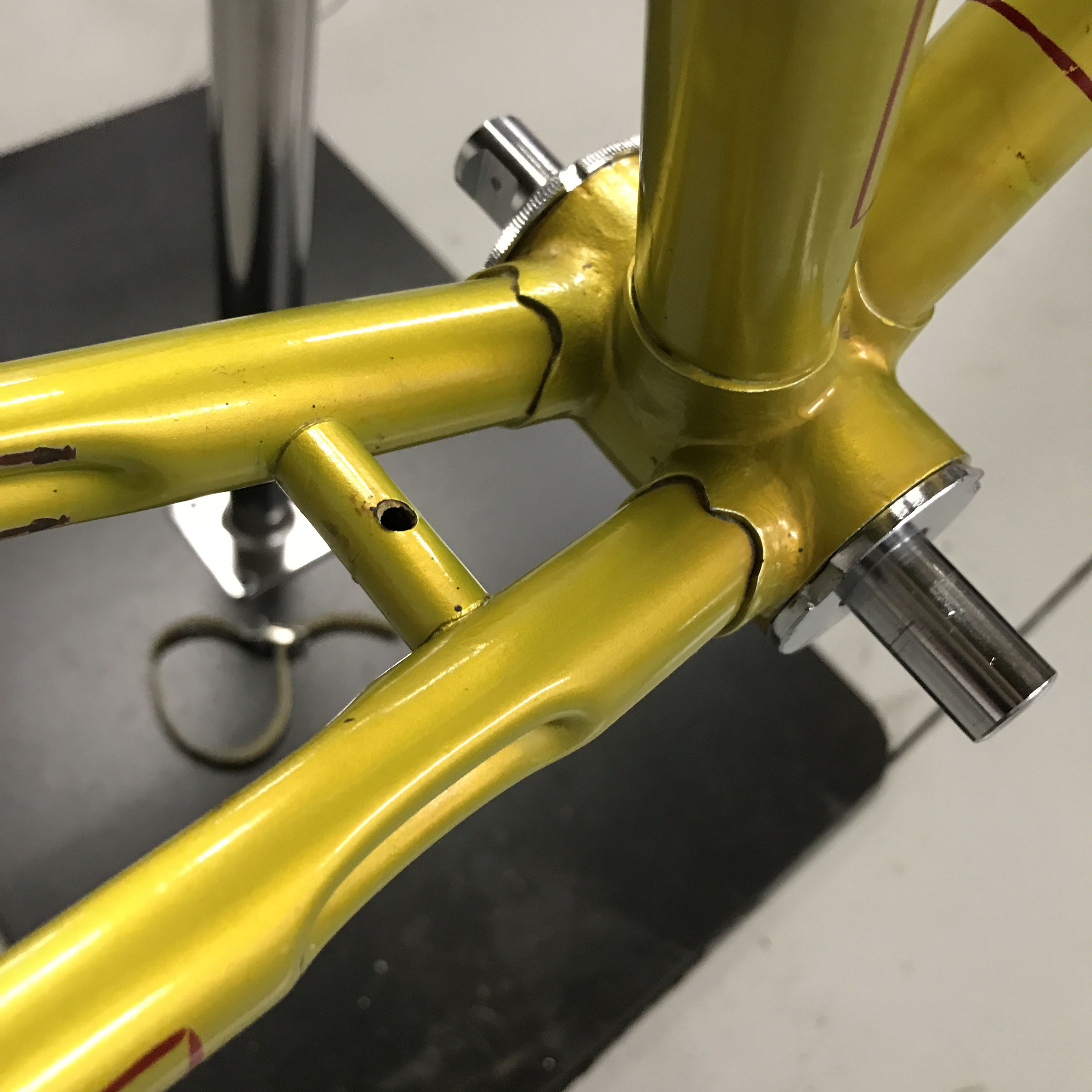 Over the years, some components like the down tube shifters or cable guides may have set a patina or stain into the paint finish (photo above). Do not try to remove these stains as they are set well into the lacquer and are permanent, however they do provide a convenient locator when you come to put everything back together.
