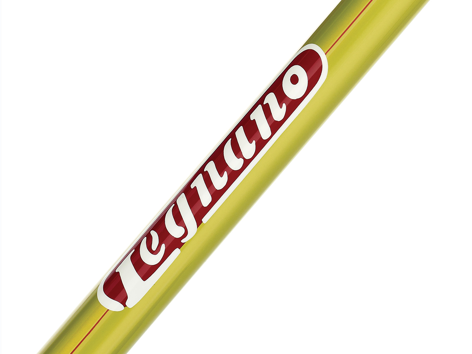 The factory finished Legnano logo on the downtube was not a water slide decal like the others. There have been replacement Legnano decal sheets produced over the years for both amateur and professional restoration however everything that I have seen is “close but no cigar” as they say and typically incorrect in scale, typography or color. In the case of the downtube logo, if you look at any original ‘lizard yellow’ frame you will see that this graphic was ‘stencilled’ and most likely by hand as the paint coverage is typically quite thick and the texture is too uneven to have been sprayed. Spray painting would have also required the balance of the frame to be masked off, a time consuming process and not well suited to factory production.