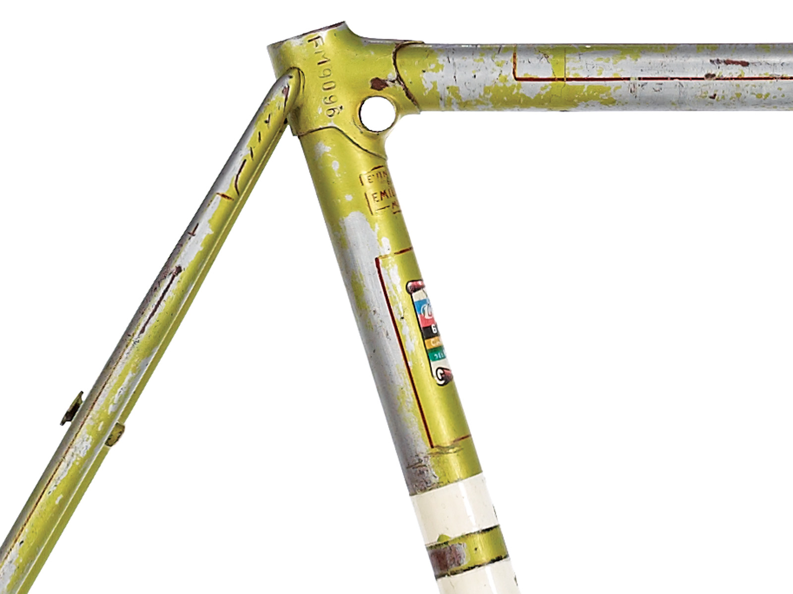 If you take a look at the well-worn 1964 Legnano Gran Premio frame above (click on images for enlargement) it will hint at the factory process of the day. Coming off the brazing torch each frame would have received a swim or two in a solvent tank to prep it for finishing. First down was the ubiquitous rust-coloured primer of the day (and most likely lead based). Next out of the gun was the metallic silver finish, and most likely also lead based given how well it adheres to even the most beat up frames that you come across. And finally the ‘lizard yellow’ lacquer (perhaps two light passes of the gun) and a newly minted Legnano was born.