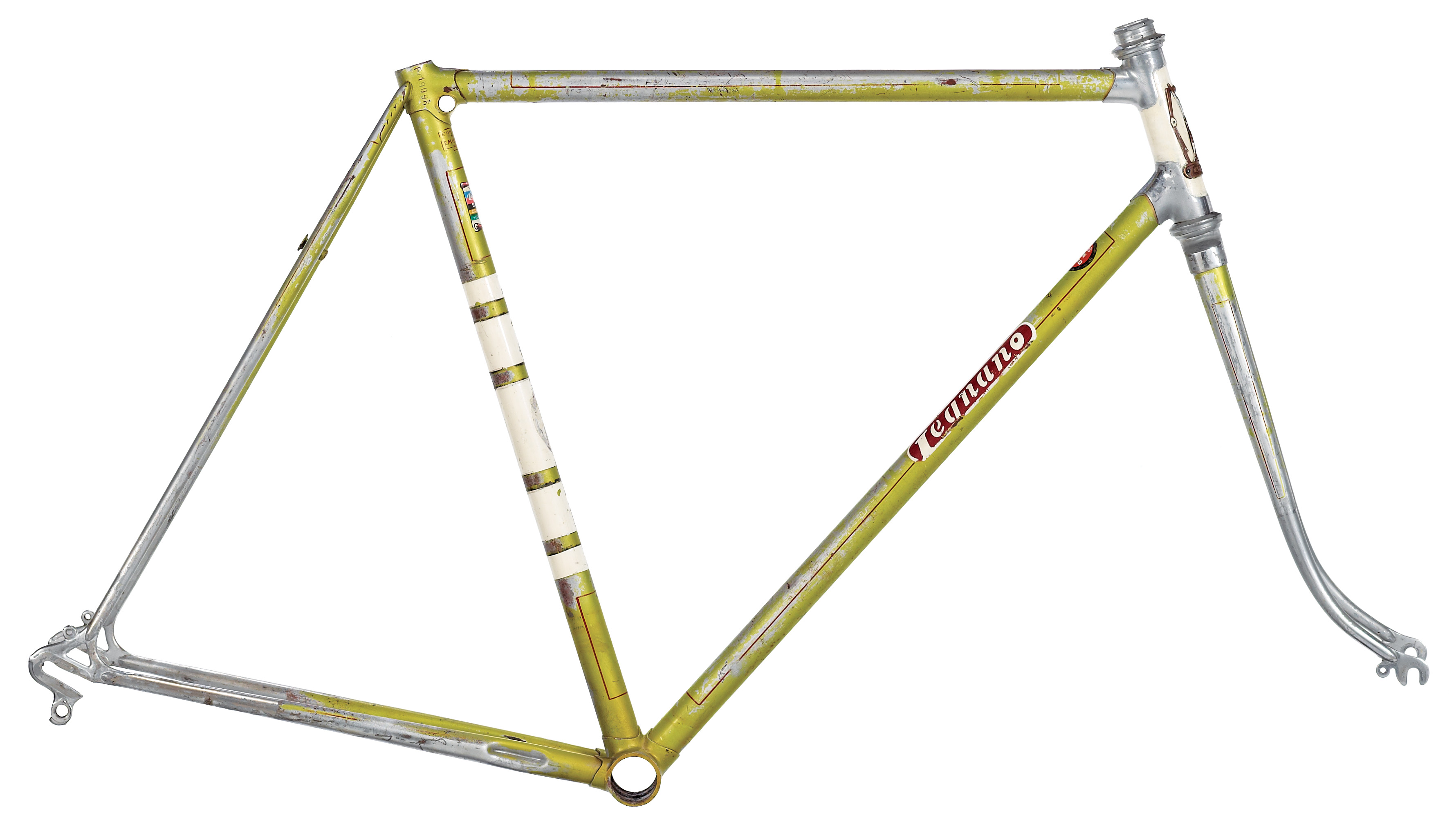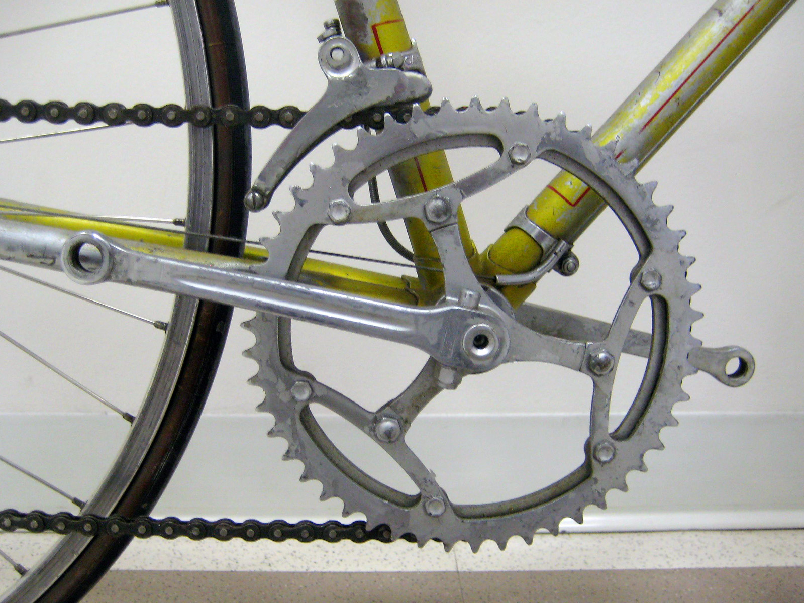 I am dating this Gran Premio to 1964 based on the sequence of the serial number and the 64 date stamp on the inside of the Magistroni crank arms. Beyond the frame, the only original parts that remain are the Universal side pull brakes, the 3TTT handlebars and stem, the Campagnolo front derailleur, cable guide and downtube shifters, pump clamps, the bottom bracket and headset, and the aforementioned Magistroni crankset. However, I have a good inventory of correct components that will bring this Gran Premio back to the orginal spec.