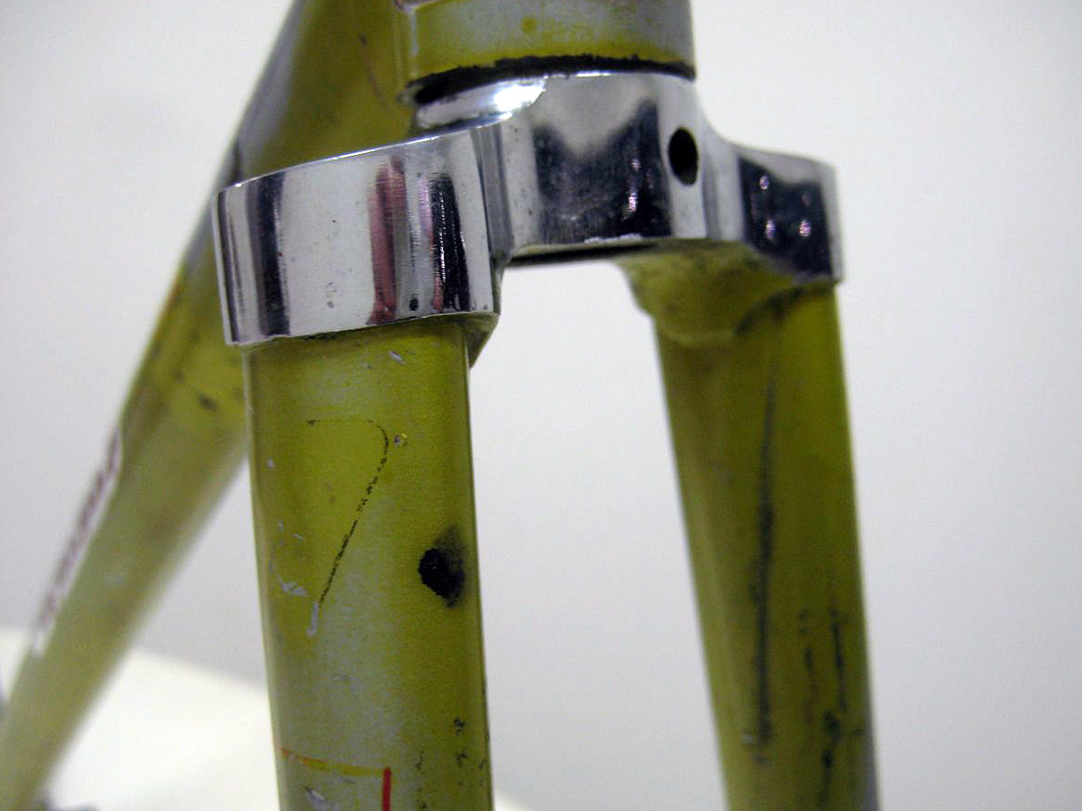 The reinforcing flanges on the brake bridge did not appear on Legnano frames until 1969/1970. On the 1969 Roma on this site, the size of the flange and the cutouts are a little smaller. All of these small details help to date Legnano frames.