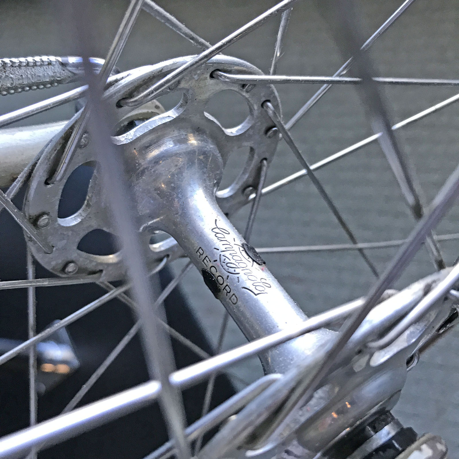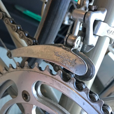 The Campagnolo Nuovo Record Strada cranks are fitted with 52/49T chainrings, the classic Italian ‘half-step’ gearing of the 1950’s and 1960’s that was in it’s final days by the early 1970’s. Looking at the condition of the teeth on the chainrings, this bike has not seen a lot of road time over the past 45 years.
