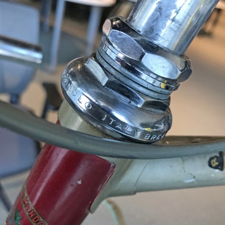 Given the crazy prices for a NOS Campagnolo headset, or one in good condition, I am glad the original owner or their shop mechanic used the proper tools when servicing the bike. The two non-Campy spacers are taking up the slack for the front brake cable hanger/stop that was removed when the Dura-Ace brakeset replaced the original Universal Mod.61 centerpull brakes.