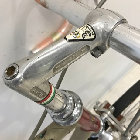 Although the elegant Cinelli 1A alloy stem was in production, this 3TTT forged alloy stem and bars were often the de facto spec on top Italian road bikes at this time with proven performance and also less expensive than the Cinelli masterpiece.