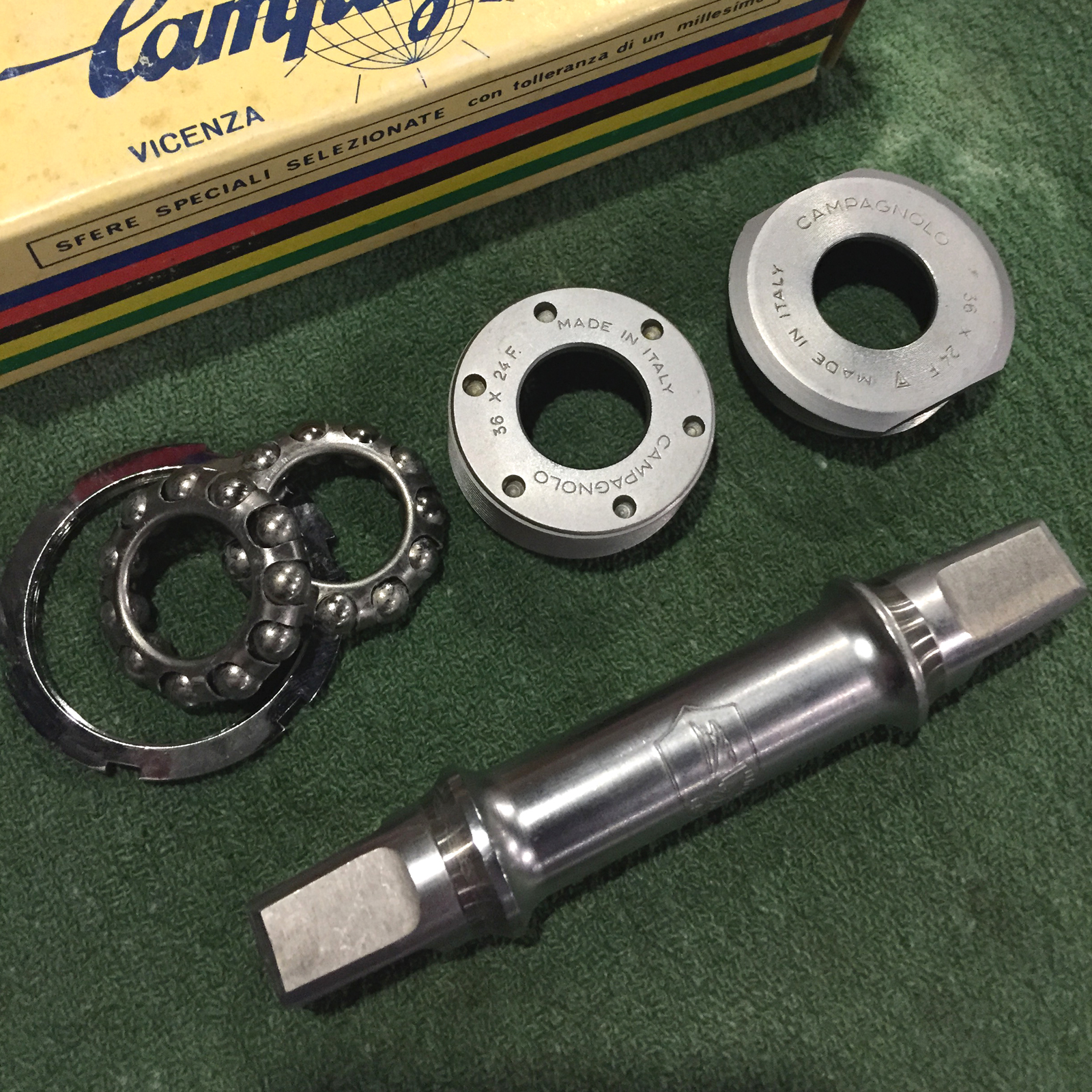 Short of the bottom bracket, you will recall from Part 1 that this Roma came into my possession as a bare frame.  The BB cups were a modern Shimano variety and went to the parts bin however the axle was a period correct Campagnolo Record part so it may remain with the build.  In my way of thinking there are only two ways to put an old bike back into service and neither include the use of modern components.