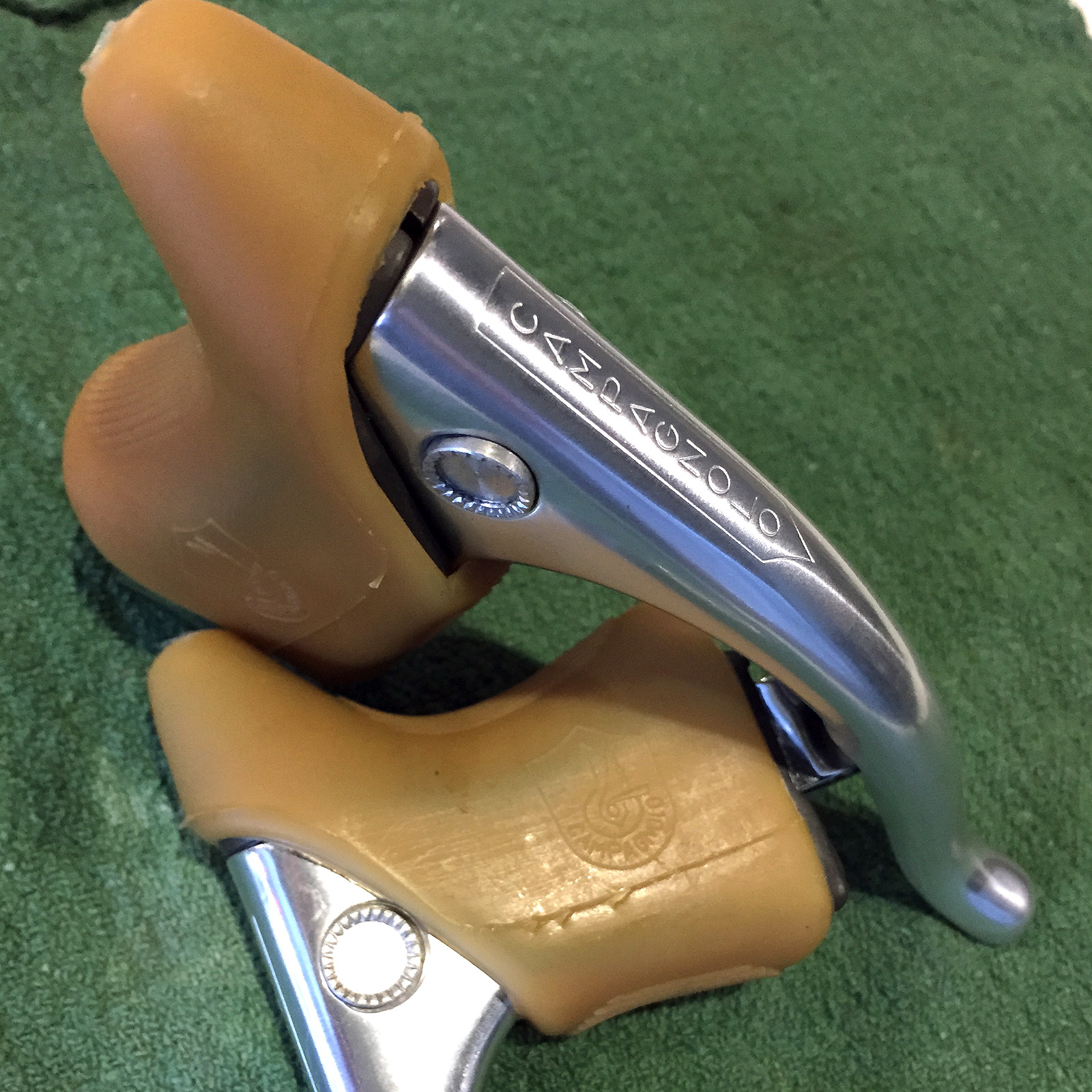 The hoods on these 2040 levers may well be a reproduction product given how nice and supple they are but if so they are very accurate to the originals. And the 2040 callipers that I was able to source are fitted with protective plastic covers on the brake shoe wheel guides, added in 1978 to comply with Consumer Product Safety Commission requirements in the United States. Both levers and callipers are in excellent condition with just a bit of minor corrosion on the brake block bolts that I should be able to clean up.