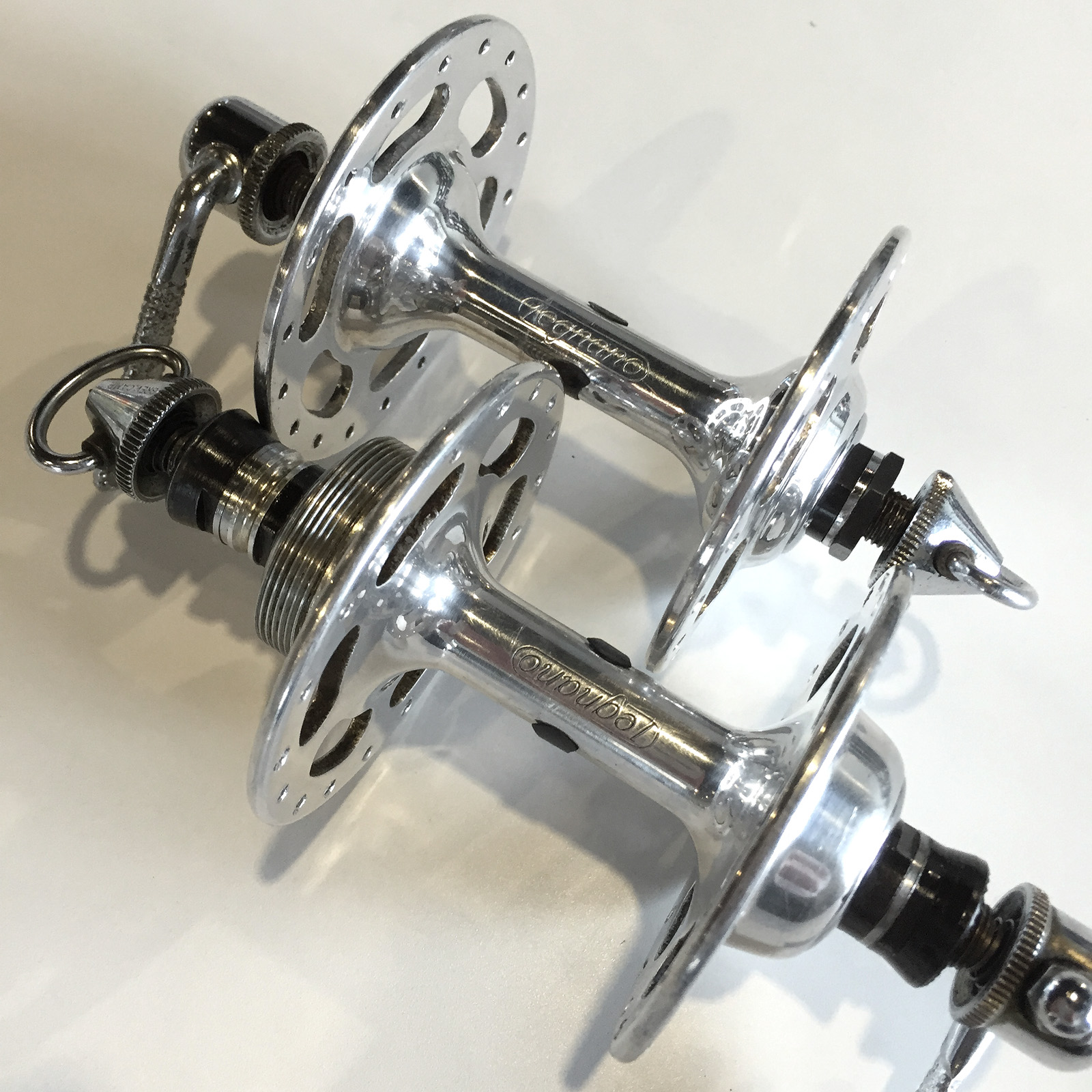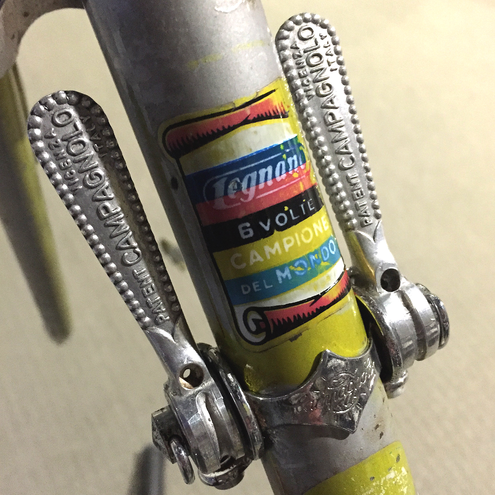 I tend to purchase Legnano branded Campy hubs whenever I come across a pair as they are becoming scarce. I pulled the locknuts off this set and they are dated 1966, a few years earlier than this ‘Specialissima’ however even on original, fully-fitted Legnano bikes I find the hub nuts often predate the bike by a year or two. This may have to do with Legnano’s purchasing and inventory practices at the time versus the actual completion and ship date of the bike.