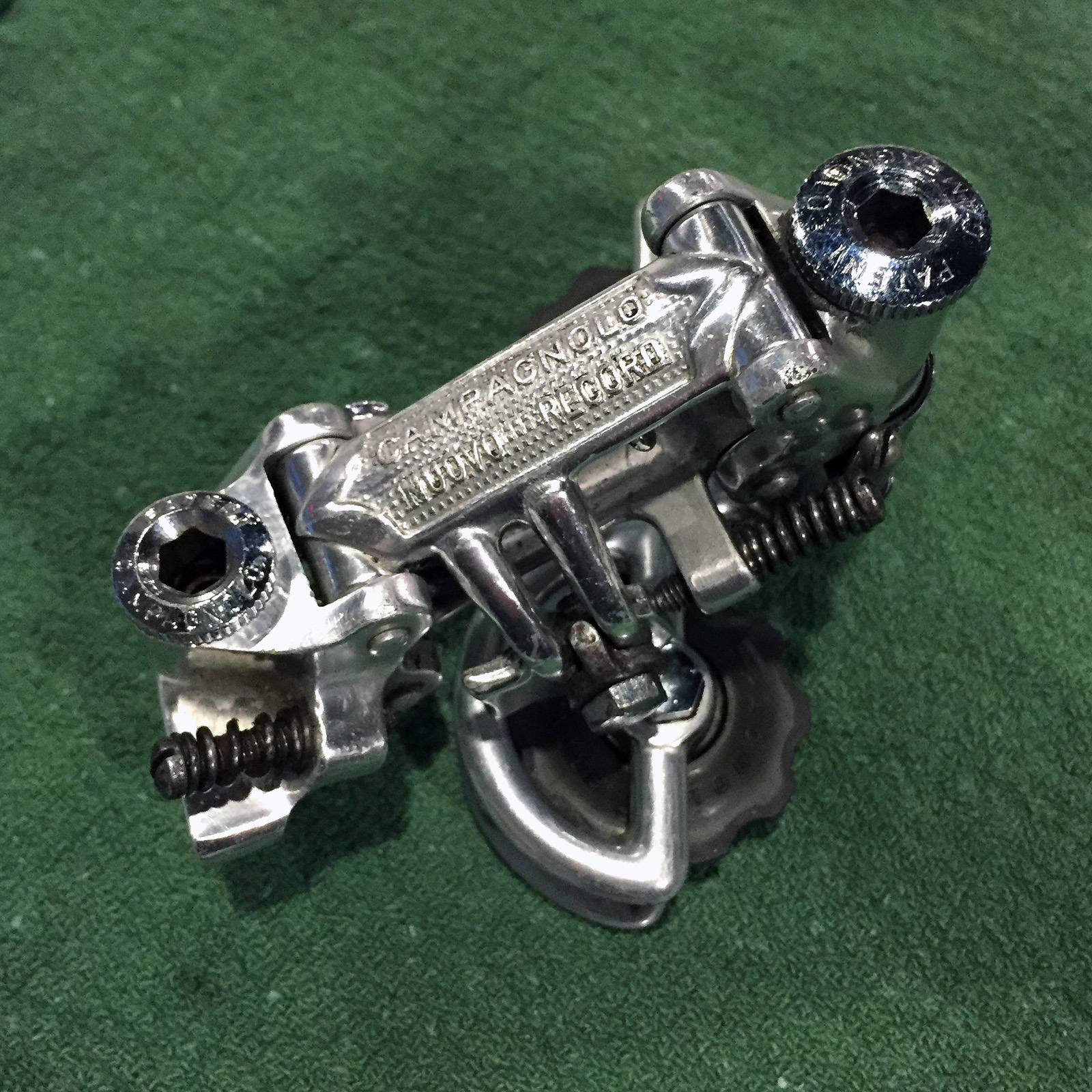 This ‘Pat.70’ stamped Nuovo Record (1020/a) rear derailleur from my part bins will definitely fit the build.  A small scuff here and there but the spring tension is strong and the jockey wheels are in good shape and not split or cracked, something common to the plastic they used at the time.  And it looks like it already had a good cleaning before I put it away, so it’s set to go.