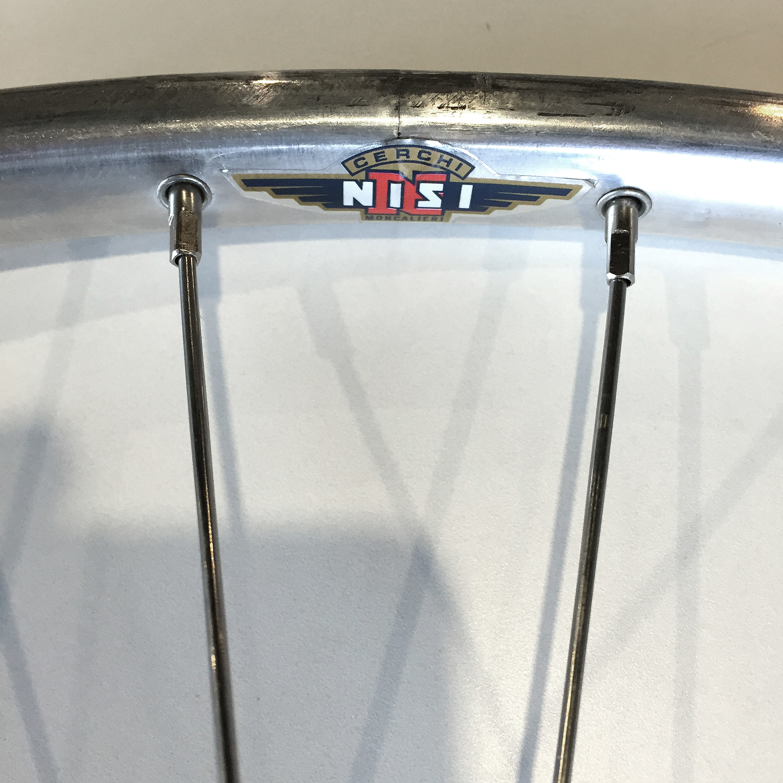 Thanks again to the parts bin, the hubs are now laced up to a set of period correct, new old stock, 36 hole Nisi tubular rims with double butted spokes.  Both Fiamme and Nisi rims where standard issue on Legnano road bikes and most other Italian marques at the time.  Fiamme rims were a little more common on the Legnano bikes imported to the U.S.A., for those of you that may be a little less familiar with the Nisi brand.