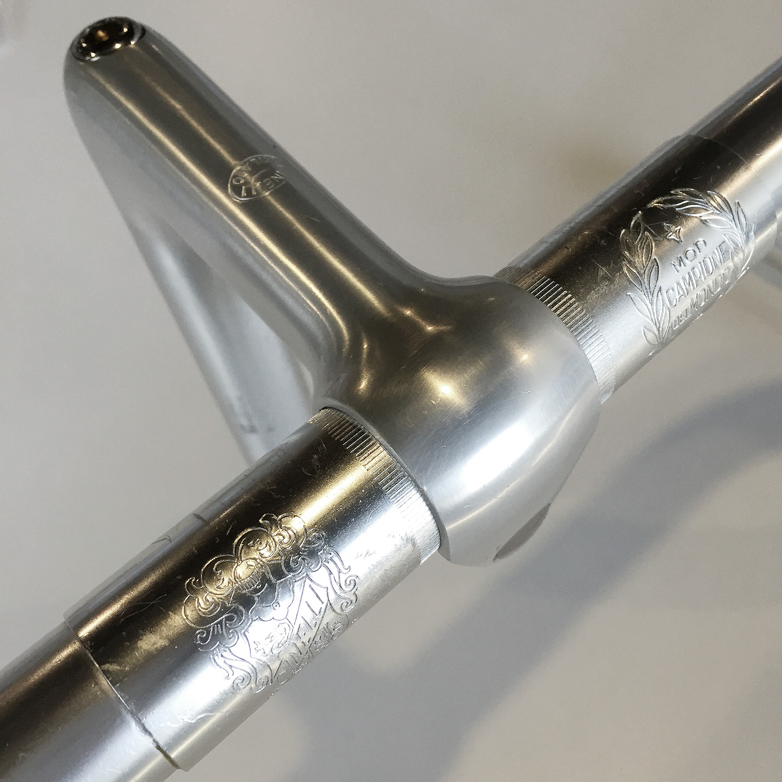 The seatpost is the Campagnolo Record 1044 that is shown in the 1958 Catalog and remained in production for decades with no substantive design or production changes. The diameter of this post is 27.2mm, compatible with Reynolds 531 tubing dimensions.  It is worth mentioning that the more common Legnano frame construction that used Falck tubing fits a 26.4mm post. Both sizes are pretty easy to come by in good condition. This post has been very lightly sanded and polished at some time to remove insertion scratches and measures 27.14mm. Fortunately the engravings were not polished away and the slight reduction in the diameter will avoid any further scratches when the post is mounted.