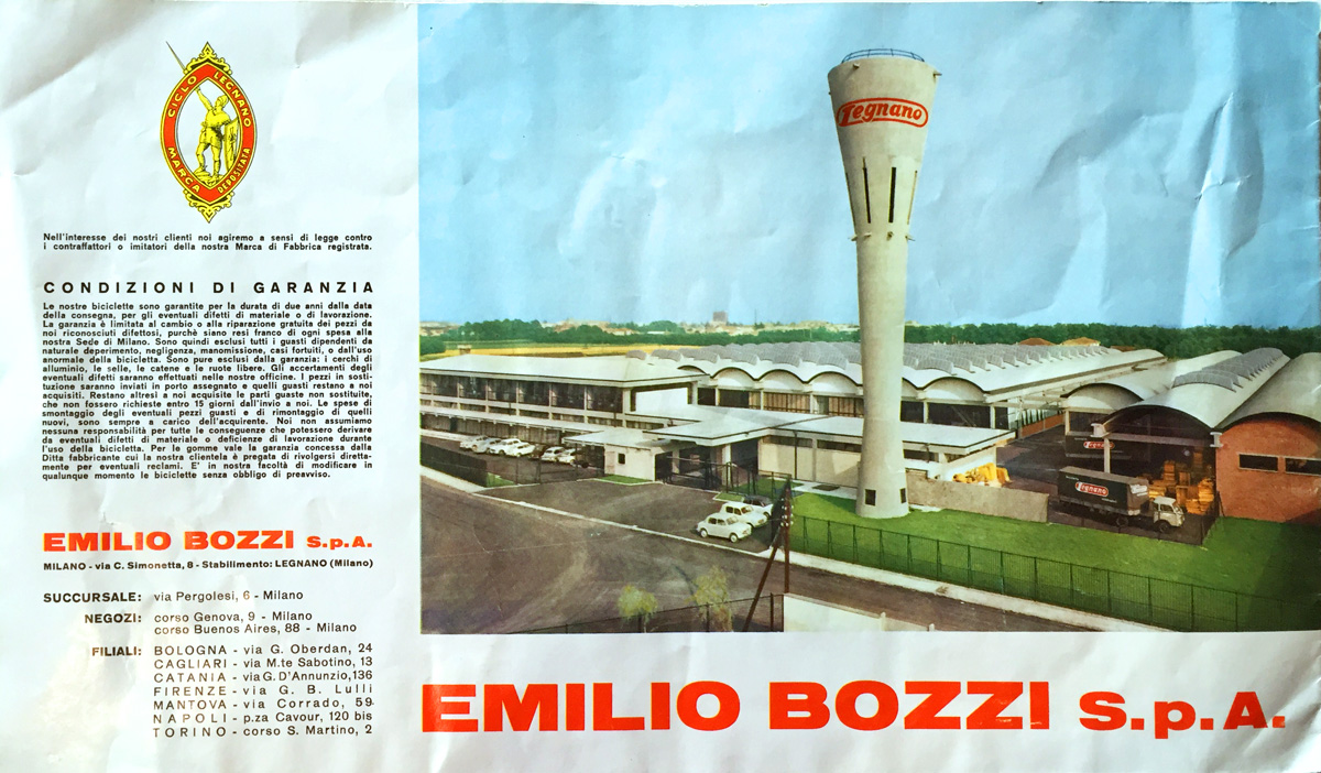 Immediately below is a photo of the Legnano factory at 1 Piazza Emilio Bozzi as illustrated on the back of a 1961 brochure. As you can see it is a sizeable factory and the water tower is also a nice piece of industrial architecture that must have an architect or engineer’s name behind it.