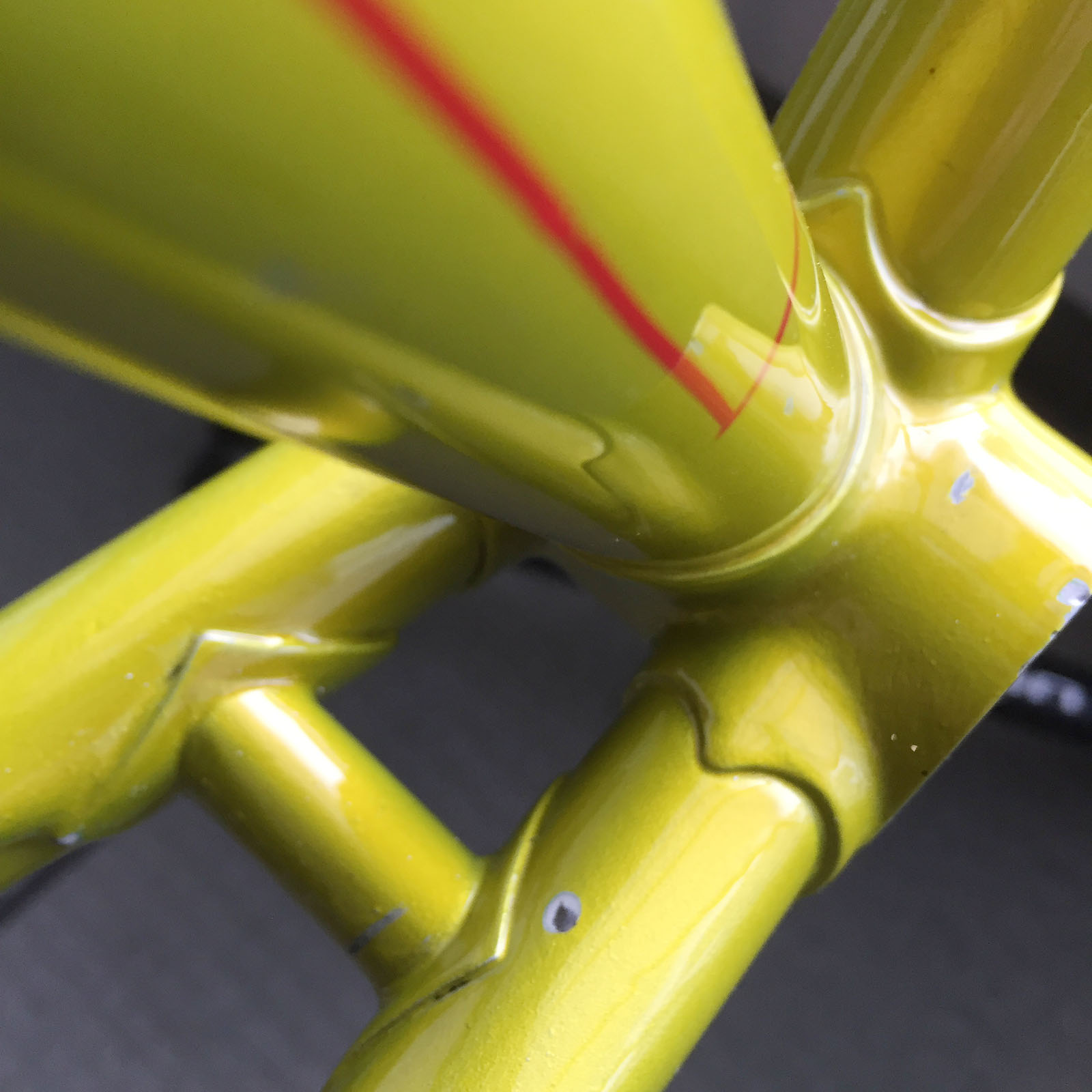 Resist any temptation to speed things up by using a hard object to scrape or chip away at old, hardened grease or road grime. Sure enough, the paint will come away with the dirt if you do so. The only other product that I use (with extreme caution) is an automotive product called ‘Mother’s Scratch Remover’. Essentially it is a liquid polishing compound that contains a mild abrasive element. This product can work to remove the ‘haze’ on old paint or to help with some of the staining that can be left on the paint from pump or brake cable clips.