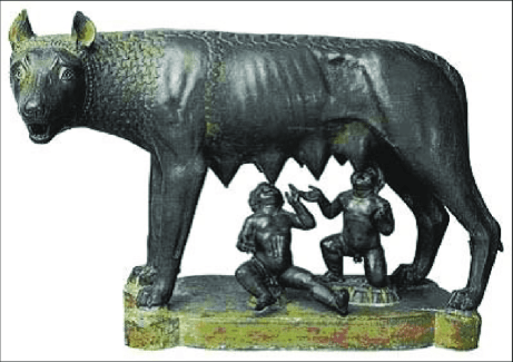 With the help of a Bike Forums member, that animal turns out to be the legendary Capatoline the ‘She-Wolf’, suckling the two twins Romulus and Remus who were the sons of Rhea, a sacred vestal virgin who bore the twins from a supernatural procreation with either Mars or Hercules as the ancient legend goes. Amulius having killed Rhea’s husband Numitor was on a quest for power and hearing of the two twins cast them into the wilderness to die.