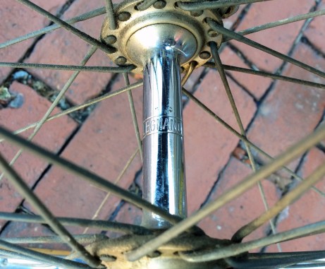 Campagnolo Gruppo Gran Sport three-piece hubs branded for Legnano. (part no. 1006) laced up with Stella double-butted spokes.