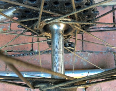 You can see the tool marks from the lathe turning on the center of this axle. As there is no functional contact in this area there was no need to grind it to the same tolerances or finish as the outer ends. The ’52’ stamped on the center of the axle was the year this part was made. Date stamping or engraving of components was common place through to the 1960’s but gradually faded away completely by the early 70’s. Familiar exceptions being Campagnolo cranks and hub locknuts that continued on a while longe. I particularly enjoying finding these date stamps on some of the early Regina freewheels.