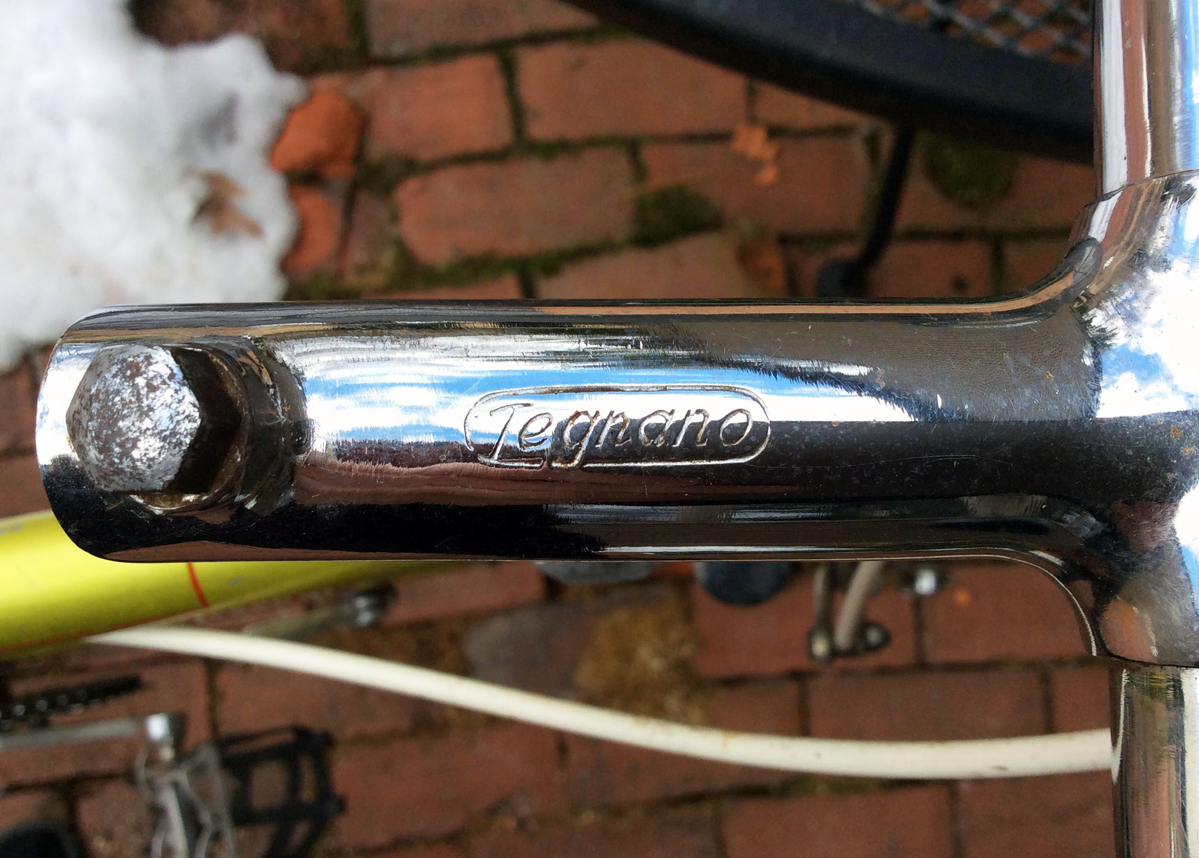 The early Legnano chrome is lovely stuff by today’s standards unless it has been neglected to the elements and pitting/rush as set in. Otherwise the light surface pitting and bits of road tar, etc. can easily be removed with a ScotchBrite pade or some VERY fine steel wool (but don’t get to aggressive). With the frame all cleaned after as many hours of careful work as your patience can manage, I then apply a couple of coats of best quality, non-abrasive Carnauba auto and polish with a soft cloth.