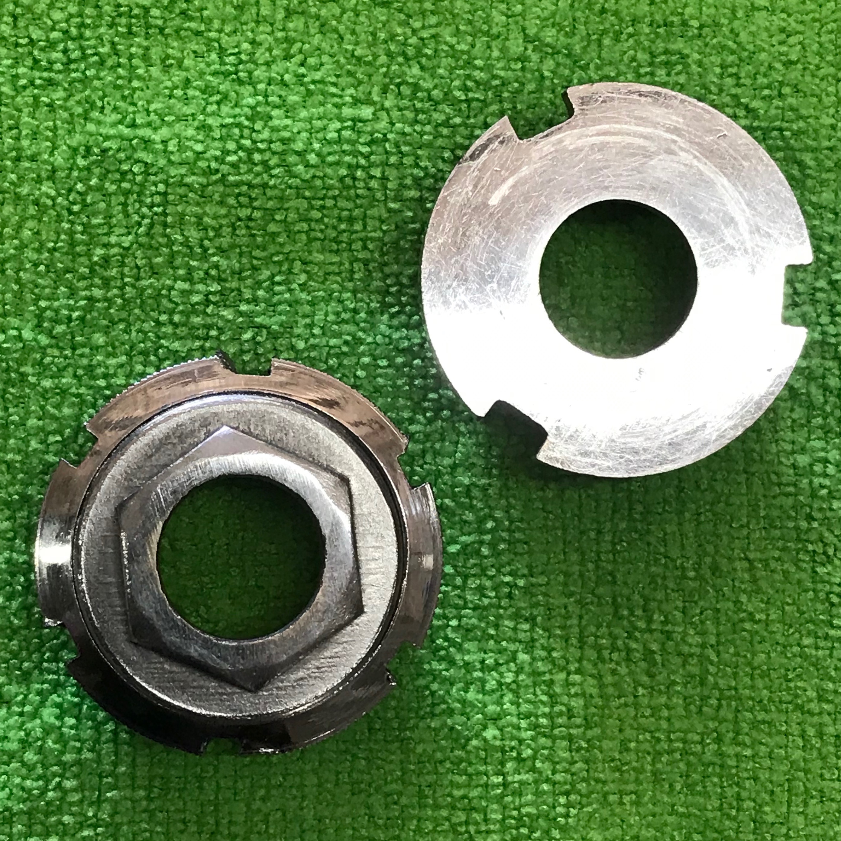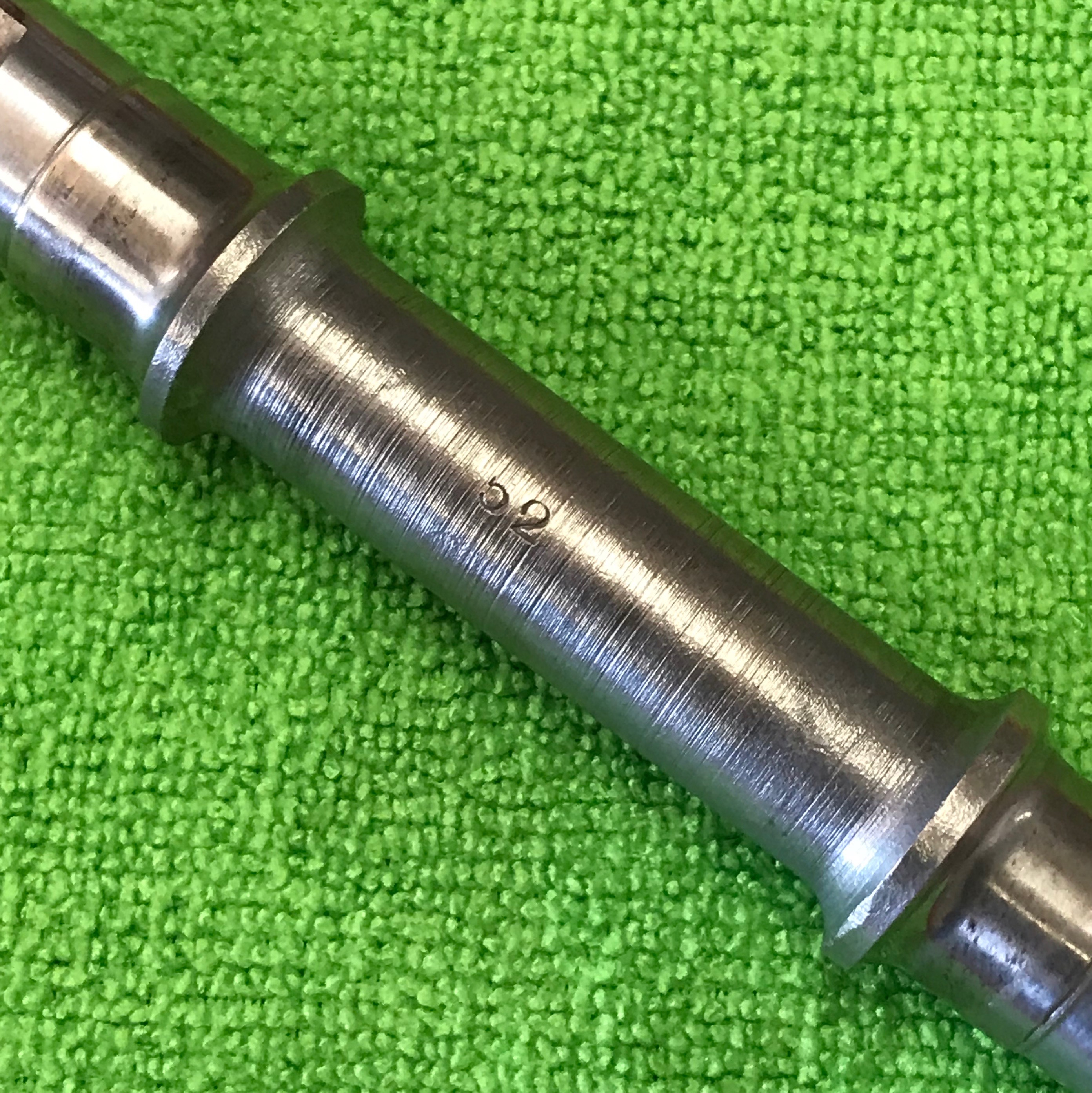 You can see the tool marks from the lathe turning on the center of this axle. As there is no functional contact in this area there was no need to grind it to the same tolerances or finish as the outer ends. The ’52’ stamped on the center of the axle was the year this part was made. Date stamping or engraving of components was common place through to the 1960’s but gradually faded away completely by the early 70’s. Familiar exceptions being Campagnolo cranks and hub locknuts that continued on a while longe. I particularly enjoying finding these date stamps on some of the early Regina freewheels.