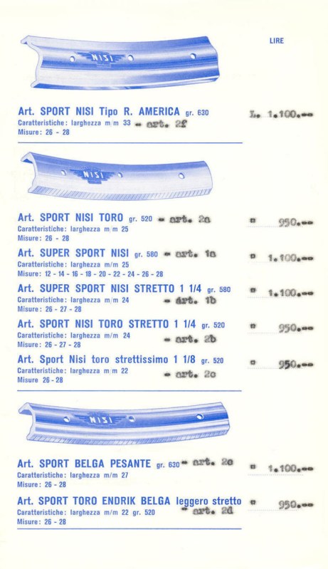 The earliest record that I have found for Nisi rims is the 1950 parts catalog of Emilio Bozzi Spa. So I am speculating that Nisi may have been part of the second wave of Italian manufacturers that surfaced after the end of the second world war (1945) as was the case with Cinelli (1947), Pinarello (1952) and Colnago (1954).