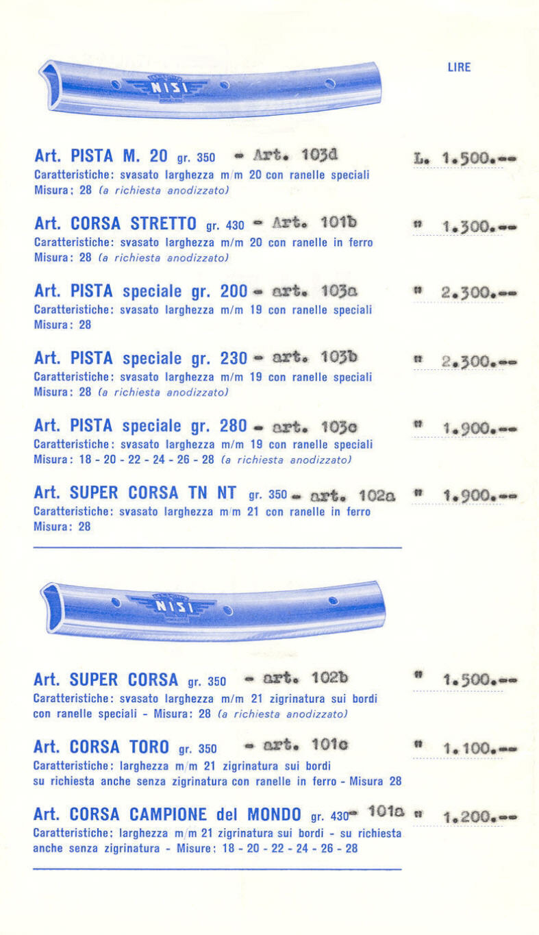 The earliest record that I have found for Nisi rims is the 1950 parts catalog of Emilio Bozzi Spa. So I am speculating that Nisi may have been part of the second wave of Italian manufacturers that surfaced after the end of the second world war (1945) as was the case with Cinelli (1947), Pinarello (1952) and Colnago (1954).