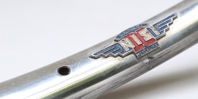 The Nisi aluminium clincher rim (mod.1622) is not something I have run across in my part scrounging over the years. Aluminium clincher rims where also produced by Fiamme and Ambrosio and they can often be found on the better, lightweight Italian sport bikes such as the 1950 Frejus Superleggera on this site.