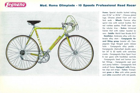 A promotional sheet (above) from the 1950’s for the Roma Olimpiade courtesy of Armando from Italy.  Notice that the Universal 61 center pull brake callipers, released in 1961, are not featured as of yet.